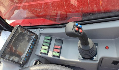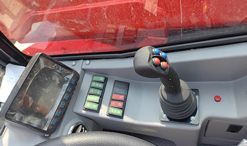 | Loader controls | Cab mounted singlelever joystick-Electric servo control of lift &lower/crowd &dump-Proportional extend/retract/aux  |